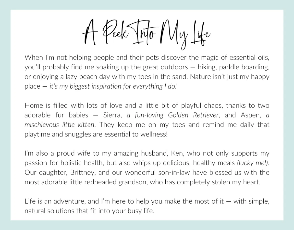 When I’m not helping people and their pets discover the magic of essential oils, you’ll probably find me soaking up the great outdoors — hiking, paddle boarding, or enjoying a lazy beach day with my toes in the sand. Nature isn’t just my happy place — it’s my biggest inspiration for everything I do!